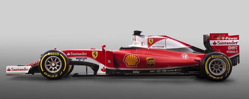 Στη Ferrari SF16H έχουνε επιλέξει τελείως διαφορετικές λύσεις όσον αφορά την αεροδυναμική. Όχι τόσο διεισδυτική αεροτομή με στόχο να κατευθυνθούν οι πλαϊνές ροές μακριά από τους στροβιλισμούς των τροχών, πλατύ ρύγχος με στόχο να κατευθυνθεί μεγάλο ποσό εσωτερικής ροής προς το εμπρόσθιο τμήμα του δαπέδου, δείχνουν να μην έχουν ανάγκη πολυσύνθετους αεροφράκτες και επιλέγουν πλατιές και απλές επιφάνειες γι' αυτούς, επιμήκη πλαϊνά με πολύ ομαλό τελείωμα πίσω και πιο μακρύ κινητήρα και κιβώτιο. Σημαντική καινοτομία της Ferrari είναι τα σχεδόν οριζόντια ψυγεία του 2015 στα πλαϊνά που ψύχονται από μικρά πτερύγια, μια λύση που προσπαθεί να αντιγράψει η Mercedes.