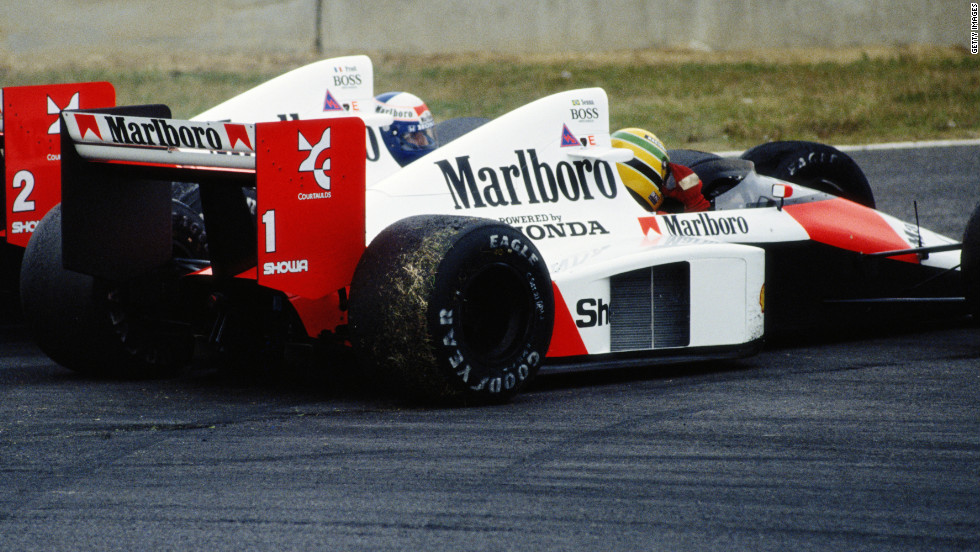 During the 46th lap of the race Prost, as he was accustomed to, left the door on his right slightly open approaching the Triangle chicane. Senna needed no warning to dive in the inside while Prost was closing the door.