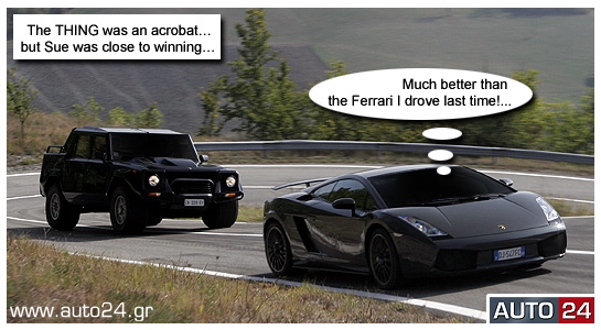 Η Sue, ξεχύθηκε σαν... σίφουνας στο δρόμο και στις απότομες αλλαγές διεύθυνσης κυριολεκτικά δεν είχε αντίπαλο. Δεν ήταν μονάχα το ασύλληπτο ζύγισμα της Superleggera, αλλά και τα νευραλγικής σημασίας ηλεκτρονικά, με πλήρες ESP, εξελιγμένα από την ίδια τη Lamborghini, που έδιναν τη δυνατότητα στη Sue να στρίβει σε «ιδανικές τρελές τροχιές» έχοντας τον απόλυτο έλεγχο. Και να αλλάζει ταχύτητες σε χρόνο dt με τη βοήθεια δύο μοχλοδιακοπτών πίσω από το τιμόνι, και αυτόματα αν χρειαζόταν (e-gear). «Amazing Feeling» αναφώνησε αιθέρια... and she put the hummer down – deep down!