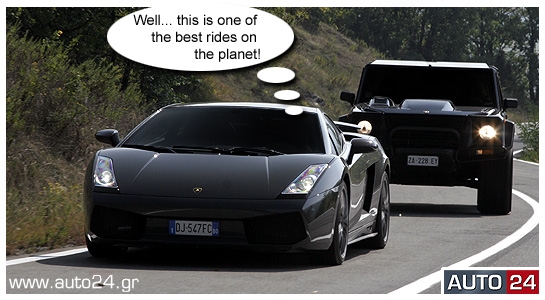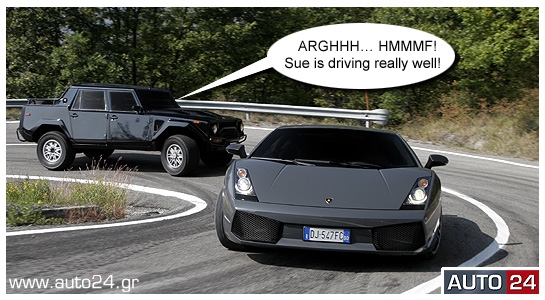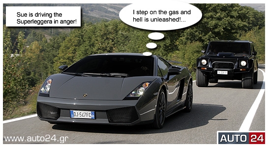 Η Sue, ξεχύθηκε σαν... σίφουνας στο δρόμο και στις απότομες αλλαγές διεύθυνσης κυριολεκτικά δεν είχε αντίπαλο. Δεν ήταν μονάχα το ασύλληπτο ζύγισμα της Superleggera, αλλά και τα νευραλγικής σημασίας ηλεκτρονικά, με πλήρες ESP, εξελιγμένα από την ίδια τη Lamborghini, που έδιναν τη δυνατότητα στη Sue να στρίβει σε «ιδανικές τρελές τροχιές» έχοντας τον απόλυτο έλεγχο. Και να αλλάζει ταχύτητες σε χρόνο dt με τη βοήθεια δύο μοχλοδιακοπτών πίσω από το τιμόνι, και αυτόματα αν χρειαζόταν (e-gear). «Amazing Feeling» αναφώνησε αιθέρια... and she put the hummer down – deep down!
